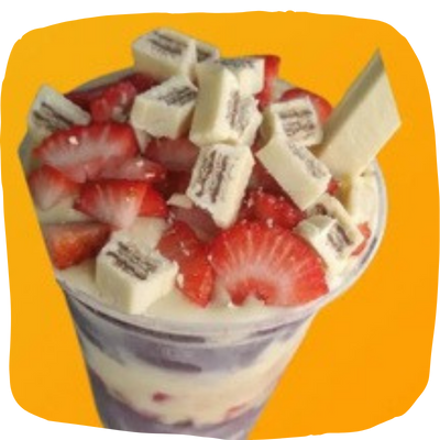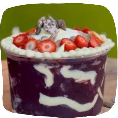 A cremosidade do açai com creme ninho, nutela, camadas de leite em pó, pedaços de kit kat branco, finalizados com morangos frescos.