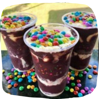 Delicioso Açaí, leite em pó, confete, gotas de chocolate e leite condensado.